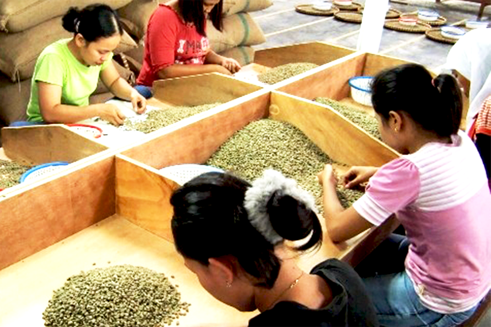 インドネシアではスマトラ式という特殊精製を行う事で独特な外観とカップ品質が有名です。収穫された完熟豆は各農家が果肉除去・発酵水洗し、パーチメントを一次乾燥します。この時点で水分値約40%、この状態を「ガバ」と言います。コレクターと呼ばれる集買業者がこのガバを買い取り、脱穀、二次発酵し、生豆(水分値13~15%)にし、比重・スクリーン・手などの選別を行います。ロット毎に精製し、生豆の状態を自ら確認することで、各農家の品質を把握しています。ユニークな精製方法のため、一般的にはマンデリンは生豆の先が裂けてしまう事が良くあります。その部分から品質劣化が起こるため、出来るだけ丁寧に選別する必要があります。これがとても大変なのですが、今回のロットは生産者の皆さんがとても厳しく選別を行ってくれていてアピアランスもきれい。それが美味しさの秘訣です。